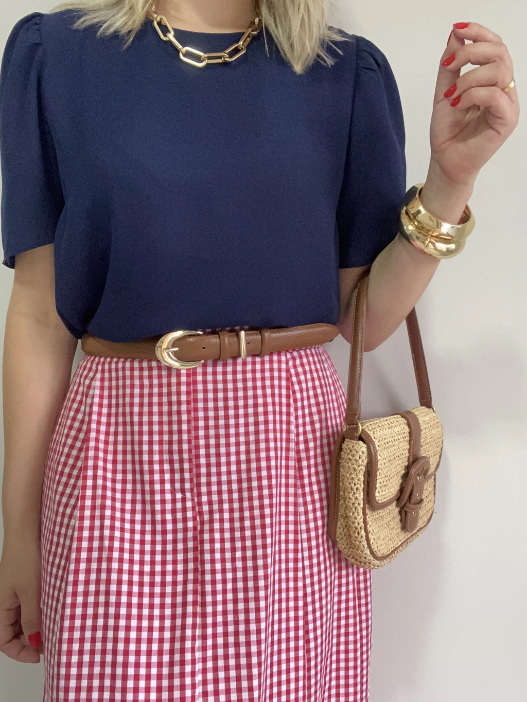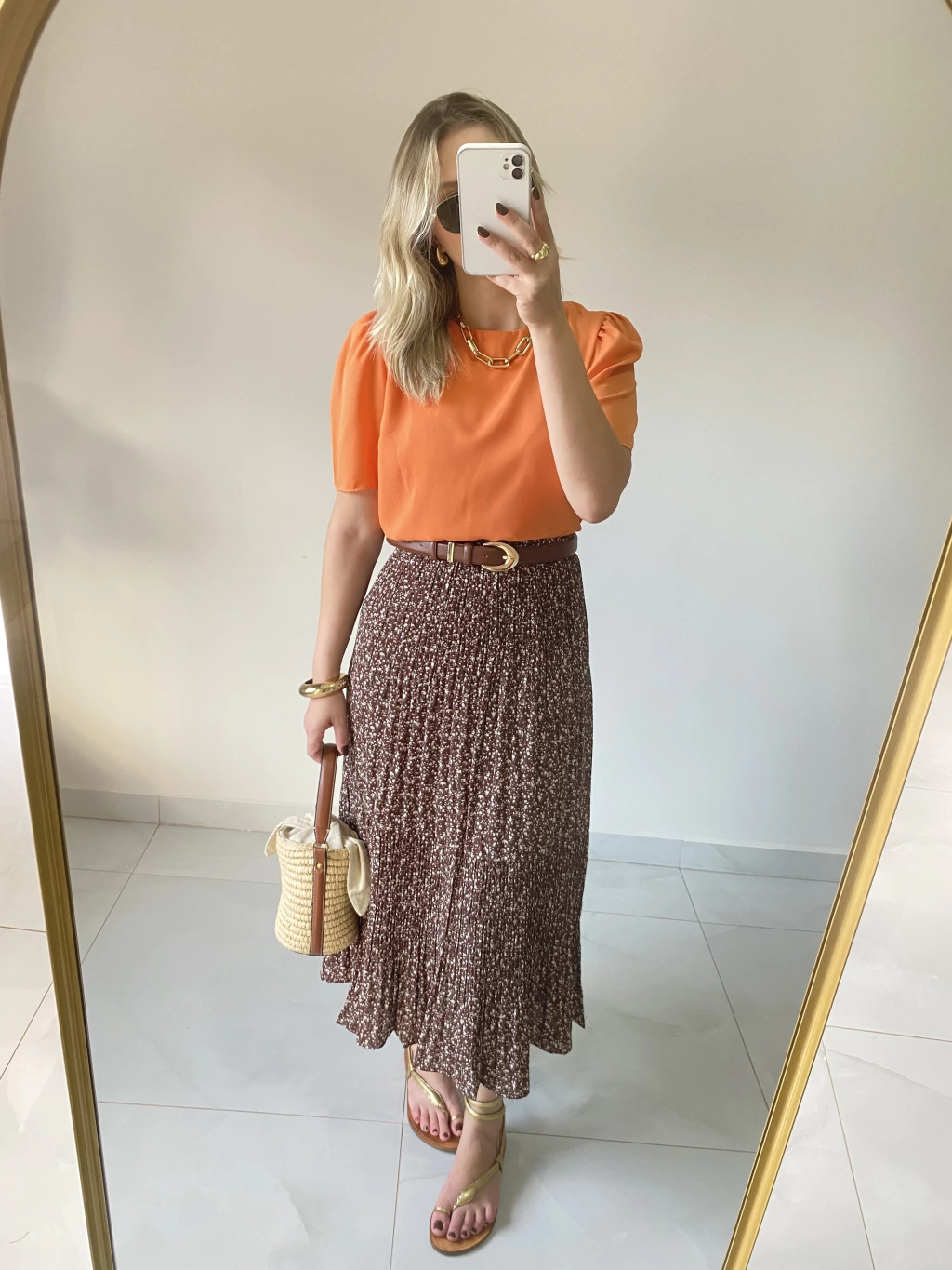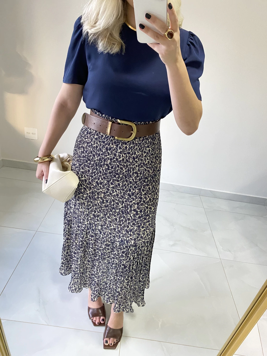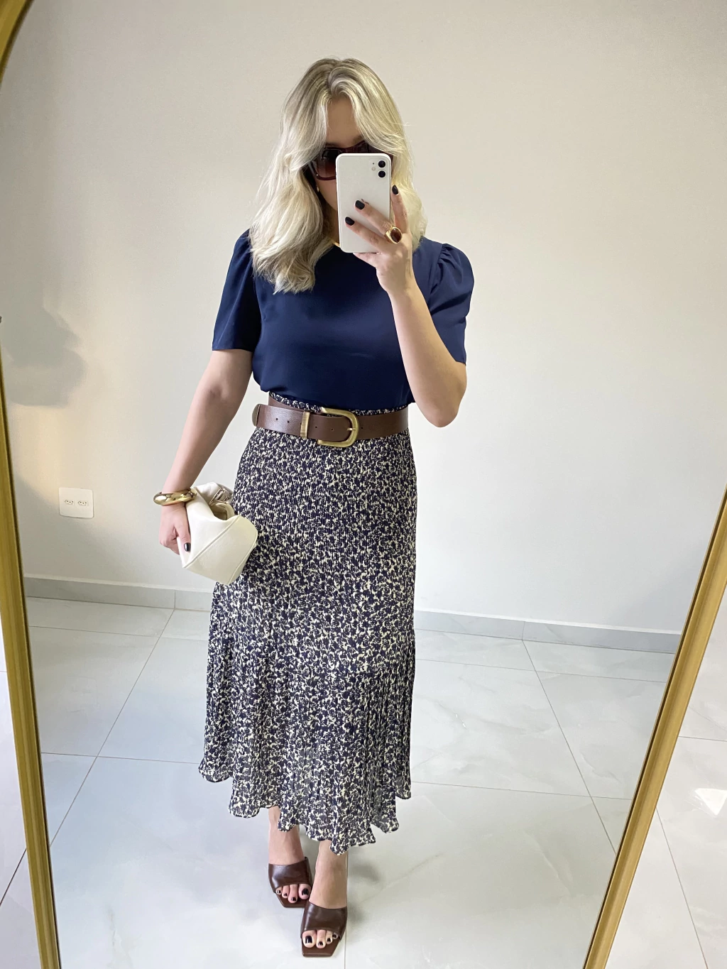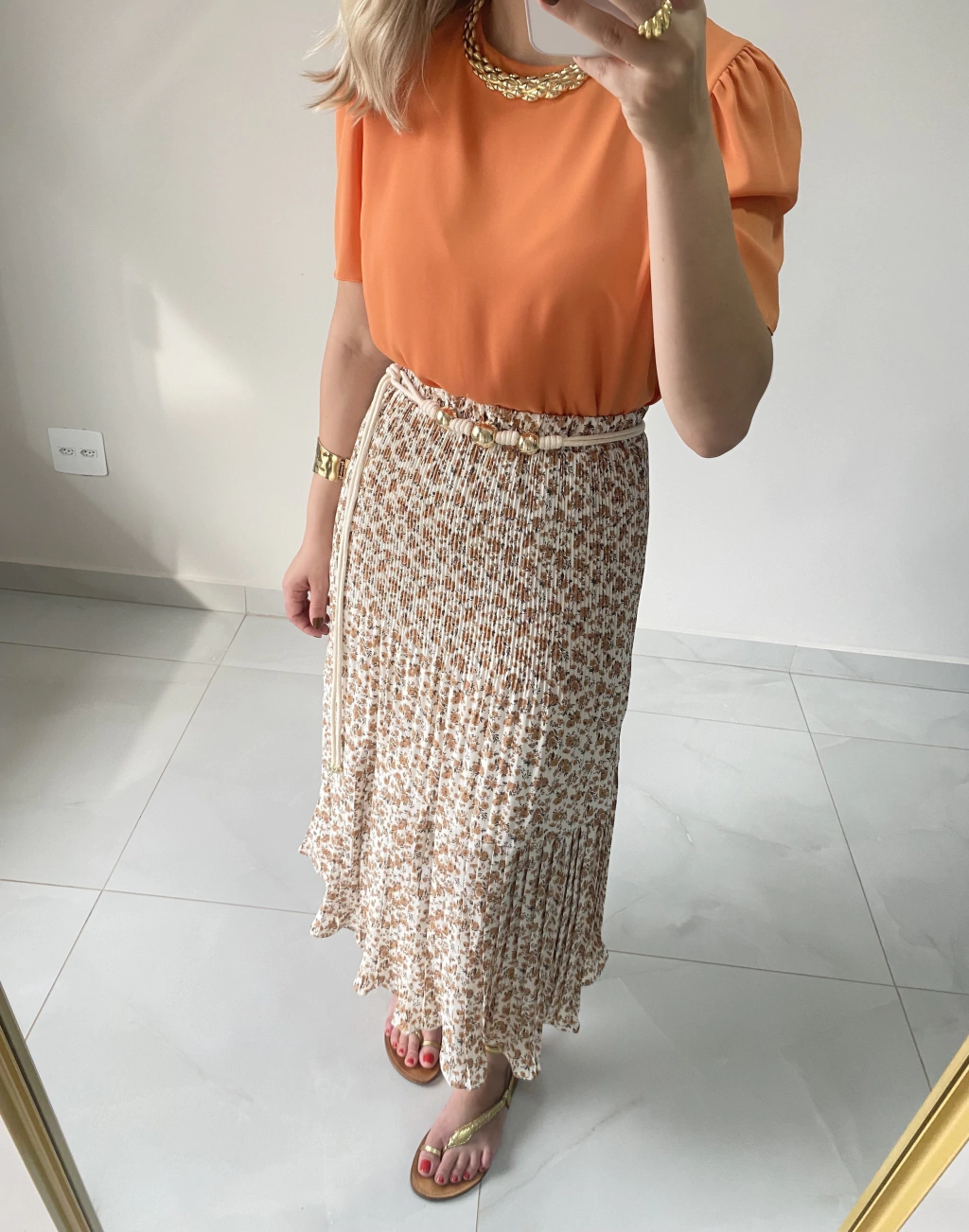 Na foto, a modelo está usando tamanho M. Medidas da modelo: Altura 1.70m, Busto 89cm, Cintura 74cm, Quadril 102cm.